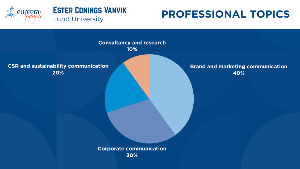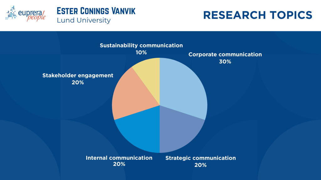 In addition to research, Ester teaches courses in corporate communication, digital communication, marketing communication, public relations, stakeholder engagement, strategic communication, strategic planning, and sustainability communication. Her teaching emphasises strategic communication, sustainability communication, PR, strategic planning, and stakeholder engagement.